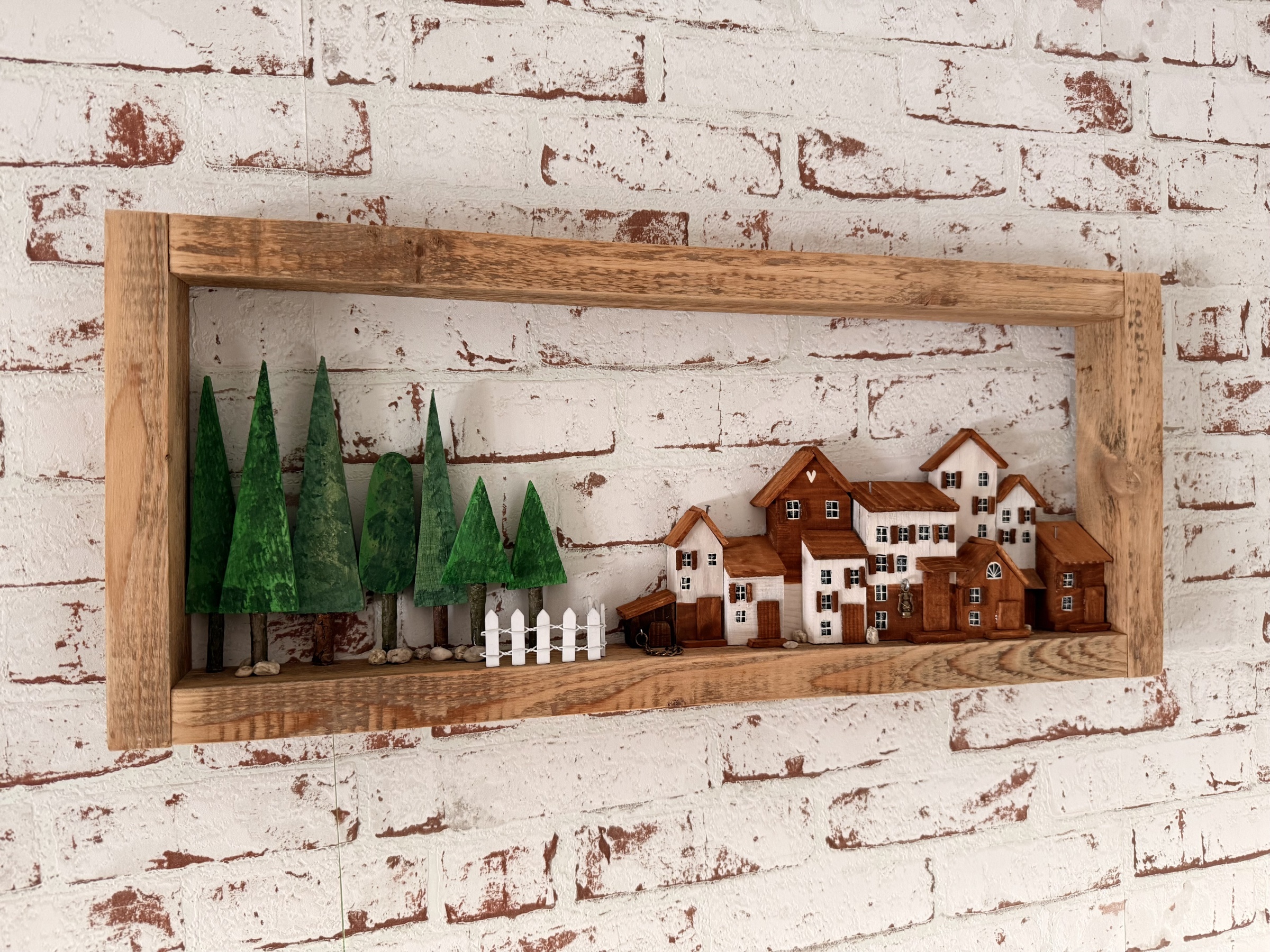 Tento dřevěný obraz z kolekce Alpské městečko v sobě nese klid horských vesnic, vůni lesa a pocit opravdového domova. Jemné hnědobílé domečky, ručně zpracované do drobných detailů, vytvářejí harmonické městečko, které přirozeně sousedí s hlubokým zeleným lesem.