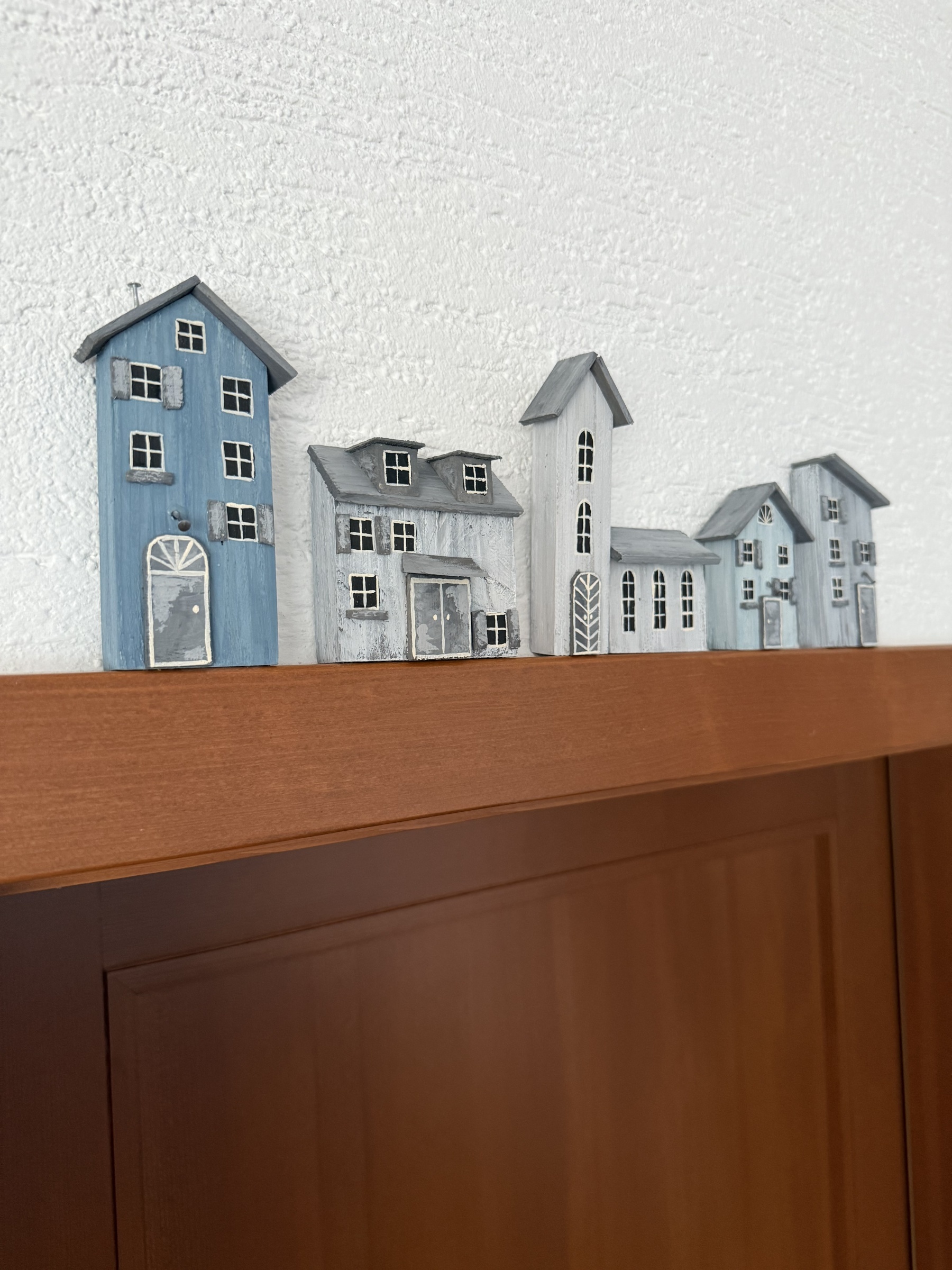 Vneste do svého domova kousek venkovského kouzla s naší novinkou z dílny S láskou vyrobené. Tato ručně vyrobená sada pěti dřevěných domečků v elegantním šedo-bílo-modrém provedení evokuje poklidnou atmosféru vesnické usedlosti a krásně oživí každý interiér.