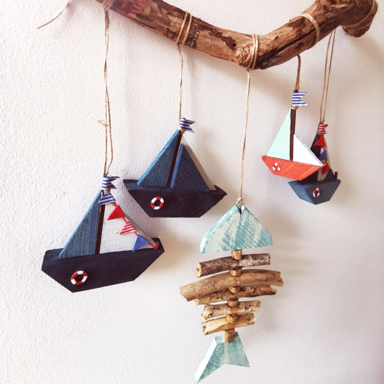 Dekorační půvab: Dřevěné loďky a symbol ryby dodávají dekoraci autentičnost a pohádkový vzhled. Tato závěsná dekorace se stane výrazným bodem jakéhokoli prostoru.