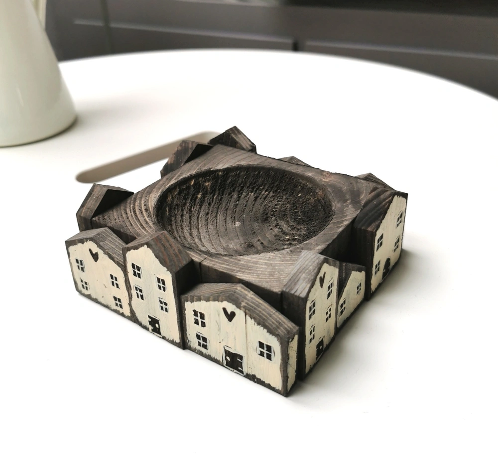 Elegantní a praktická dekorace: Tato dřevěná miska není jen praktickým úložným prostorem, ale také nádherným a originálním kouskem dekorace. Ručně vyrobená s důrazem na detaily, zdobená dřevěnými domečky, přináší do vašeho domova jedinečný a stylový prvek.