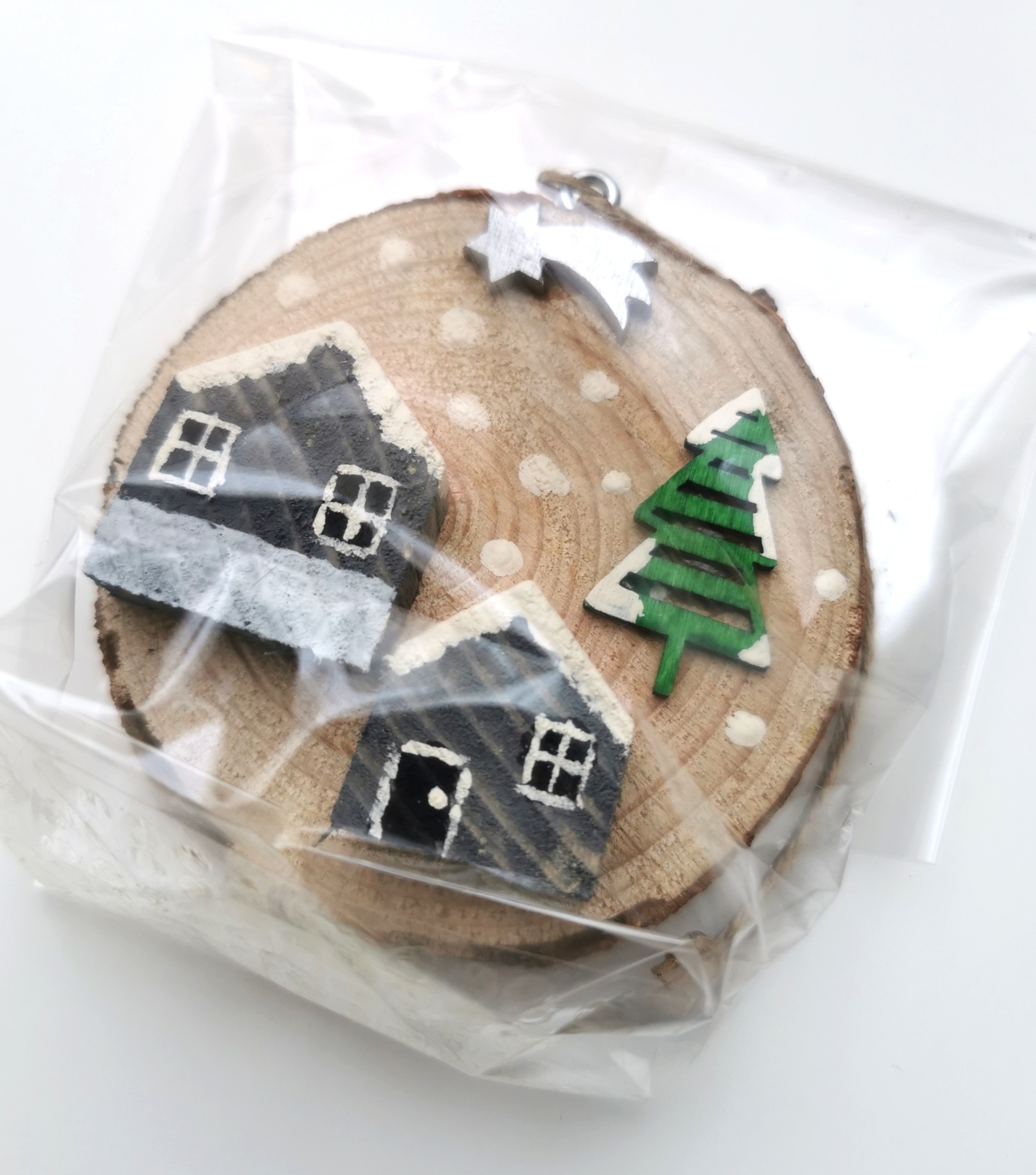 Dopřejte svému domovu hřejivou zimní či vánoční atmosféru s touto originální závěsnou dekorací. Je vyrobena z kulatiny o průměru přibližně 7 cm, na kterou jsou ručně připevněny a namalovány drobné domečky spolu s veselým stromečkem. Díky provázku ji můžete pověsit na vánoční stromeček, záclonu, garnýž, kliku u skříně či kamkoli jinam, kde chcete vnést kousek zimního kouzla.