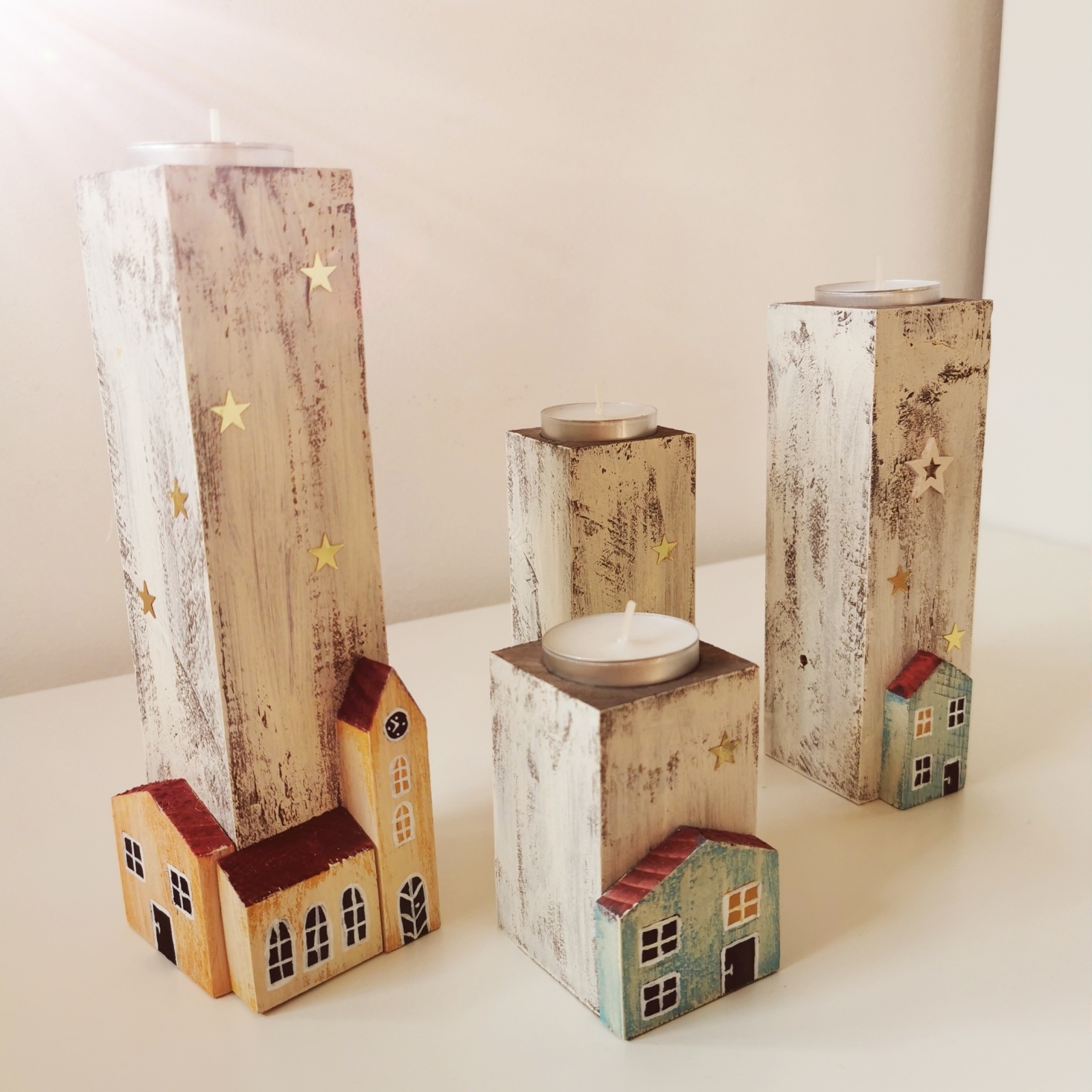 - Dřevěný čtyřdílný svícen s dekoracemi s domečků (8-20cm)