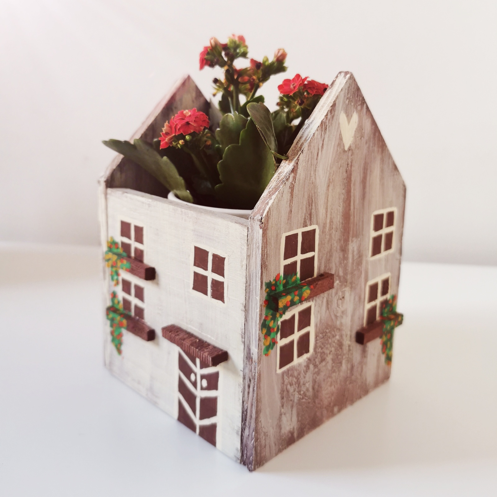 Dřevěný obal na květináč ve tvaru domku