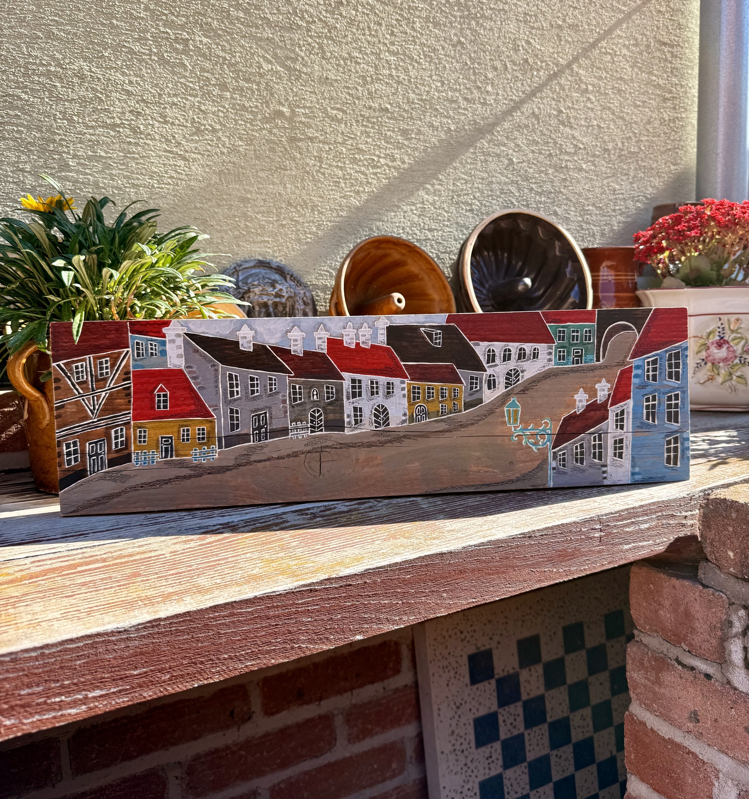 Proměňte svůj domov v kouzelné místo s tímto ručně zpracovaným dřevěným obrazem, který působí jemně starobyle a patinovaně. Motiv malebné uličky s bránou a barevnými romantickými domečky vás přenese do světa pohádek, klidu a nostalgie – přesně tam, kde se chcete cítit dobře.