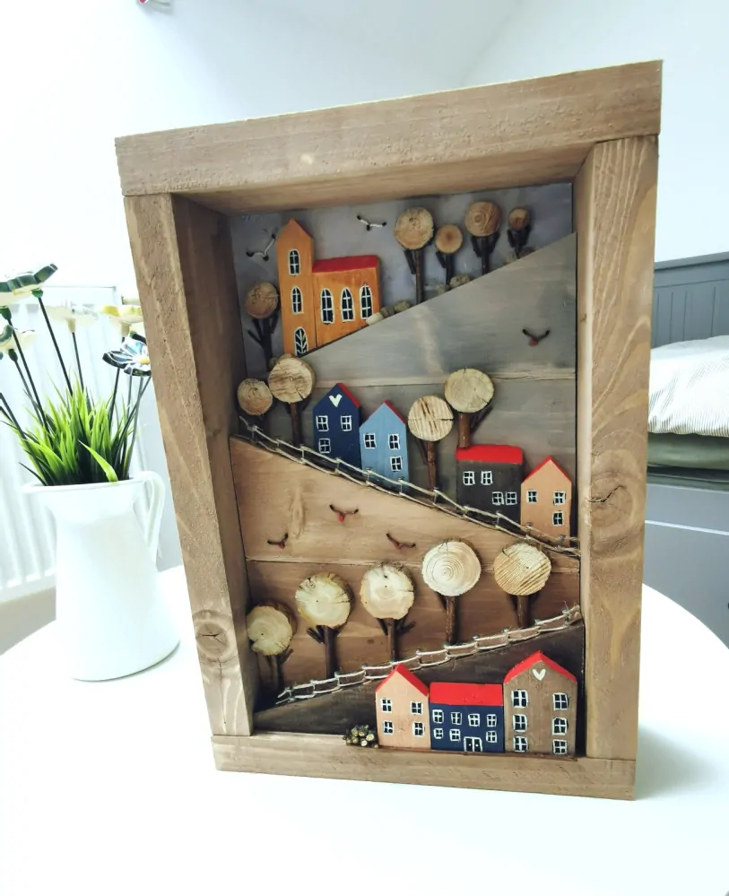 - Dřevěný obraz s domečky - Nebeská pouť