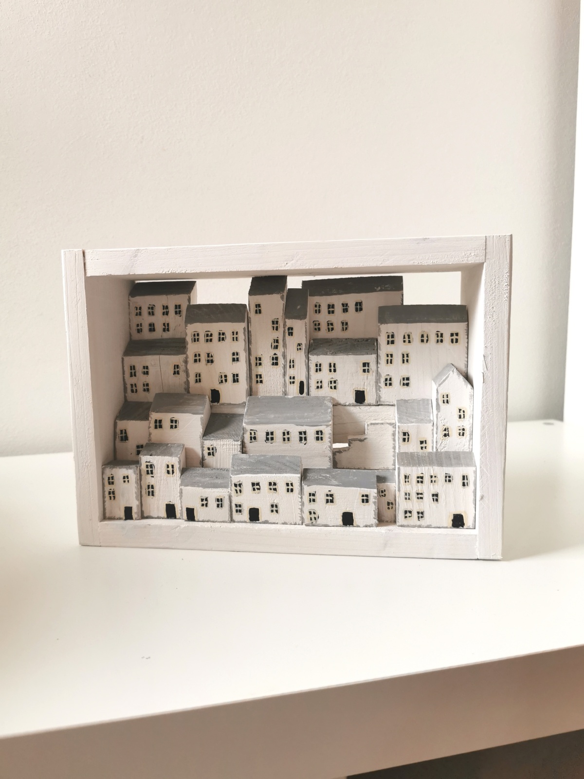 - Dřevěný obrázek plný bílých domků s hlubokou perspektivou