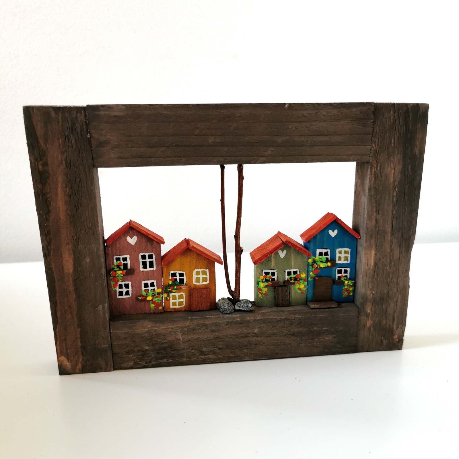 Dřevěný obrázek s domečky: Ručně vytvořená vesnička barev a radosti