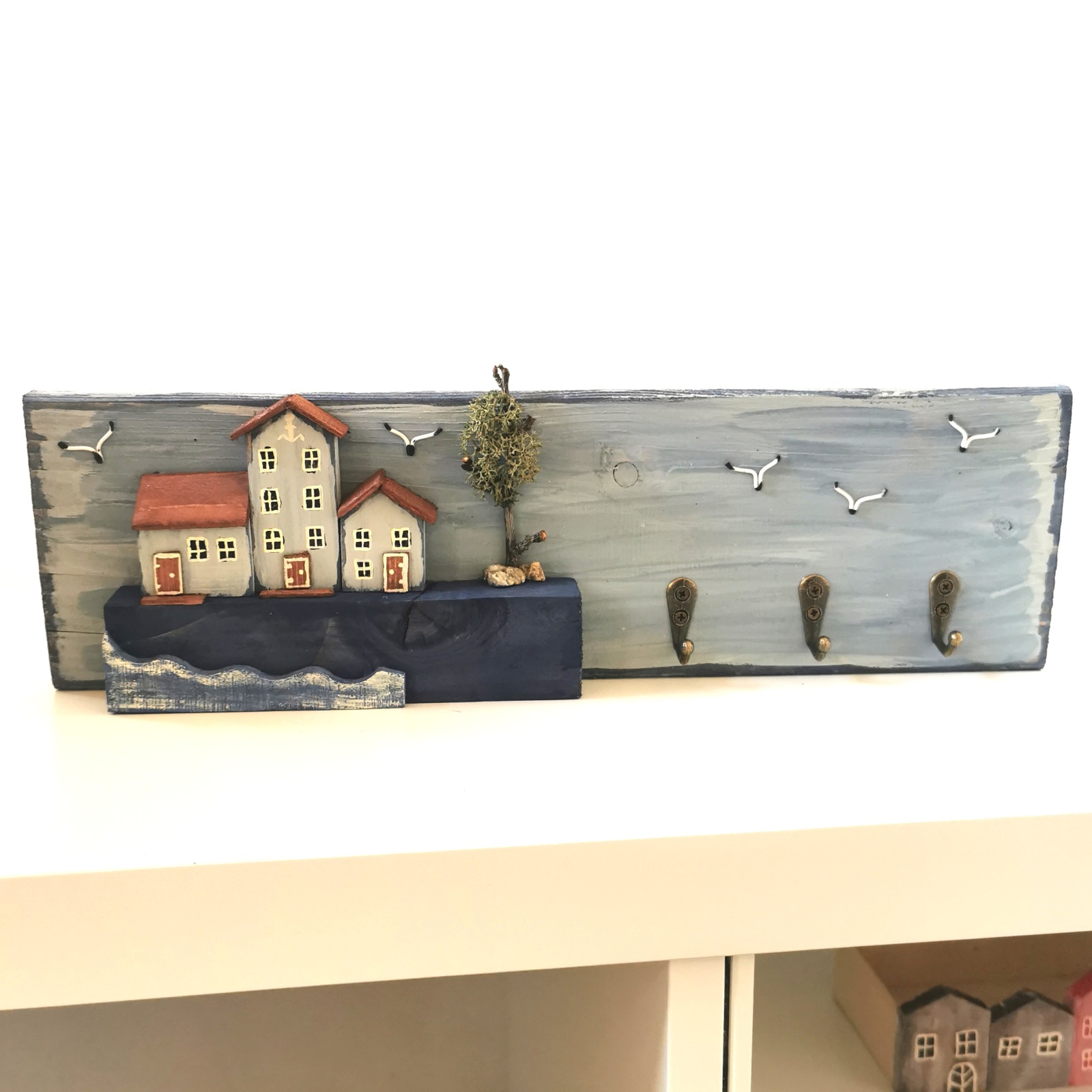 Přidejte nádech námořní elegance do vašeho domova s naším přímořským dřevěným věšákem s domečky. Praktický, stylový a plný charakteru - ideální pro ty, kdo si cení kvality a jedinečnosti.