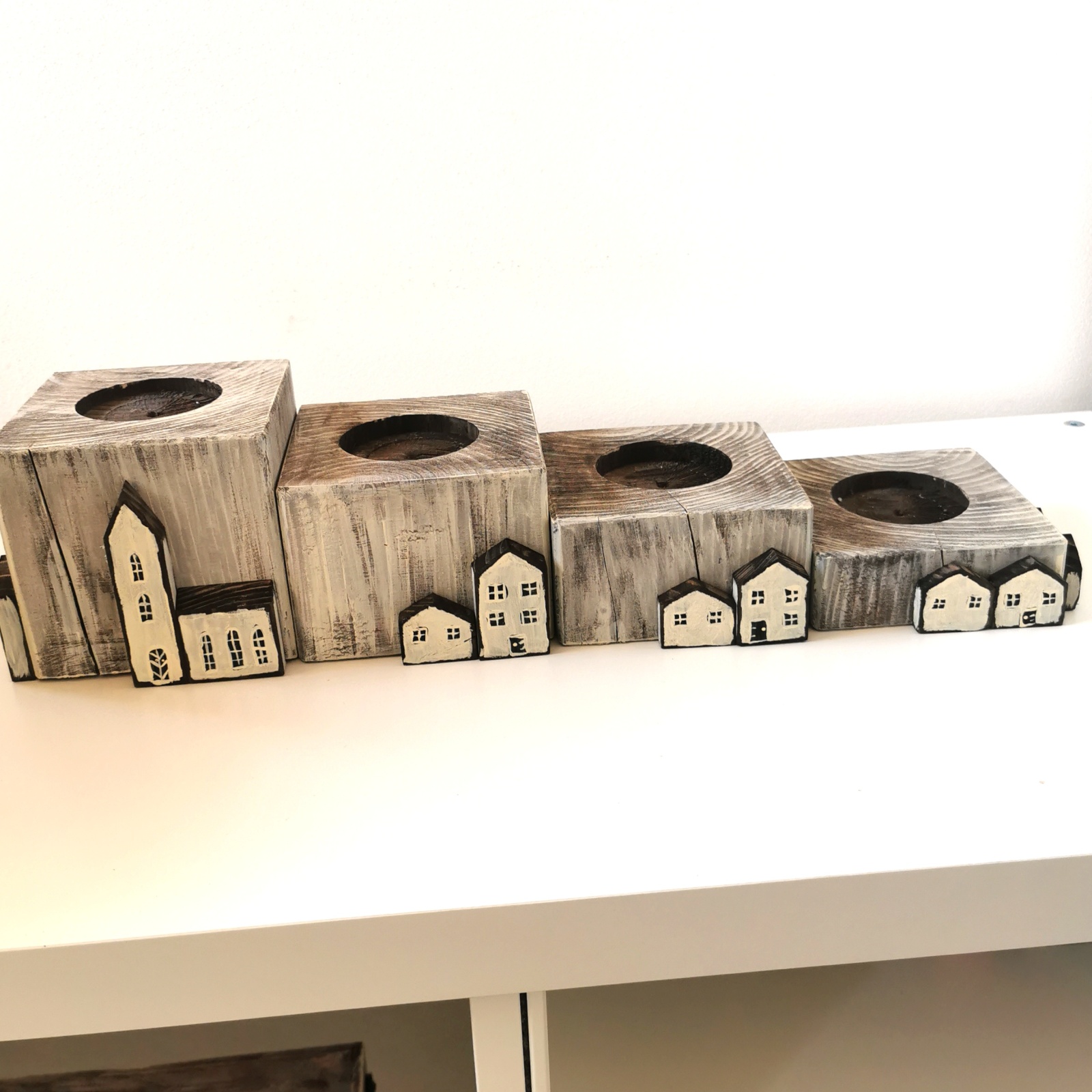 - Dřevěný rustikální čtyřdílný svícen s dekoracemi s domečků - MAXI (bez svíček)