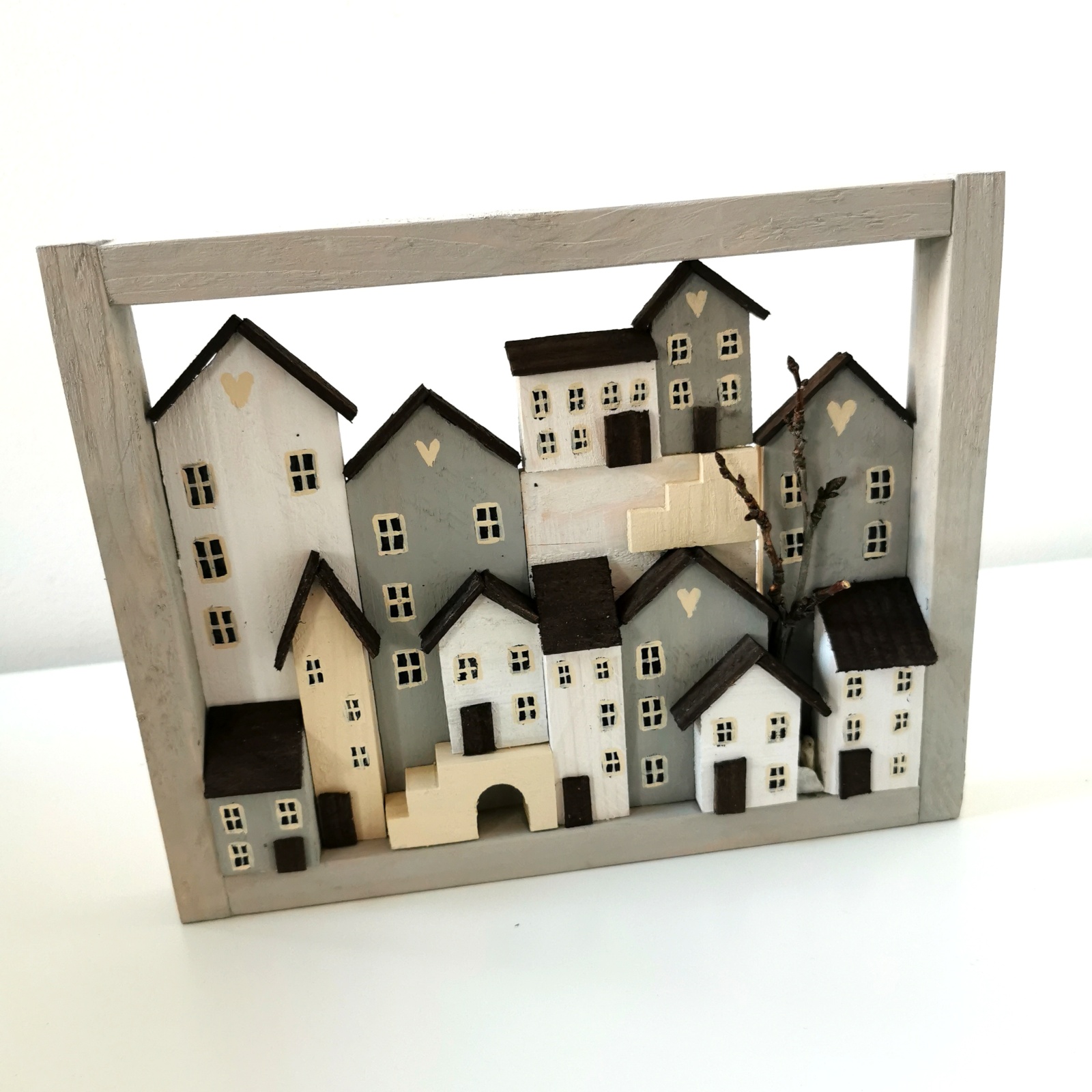 Dřevěný šedobílý obrázek plný domečkůskladem650 Kč/ ks537 Kč bez DPH