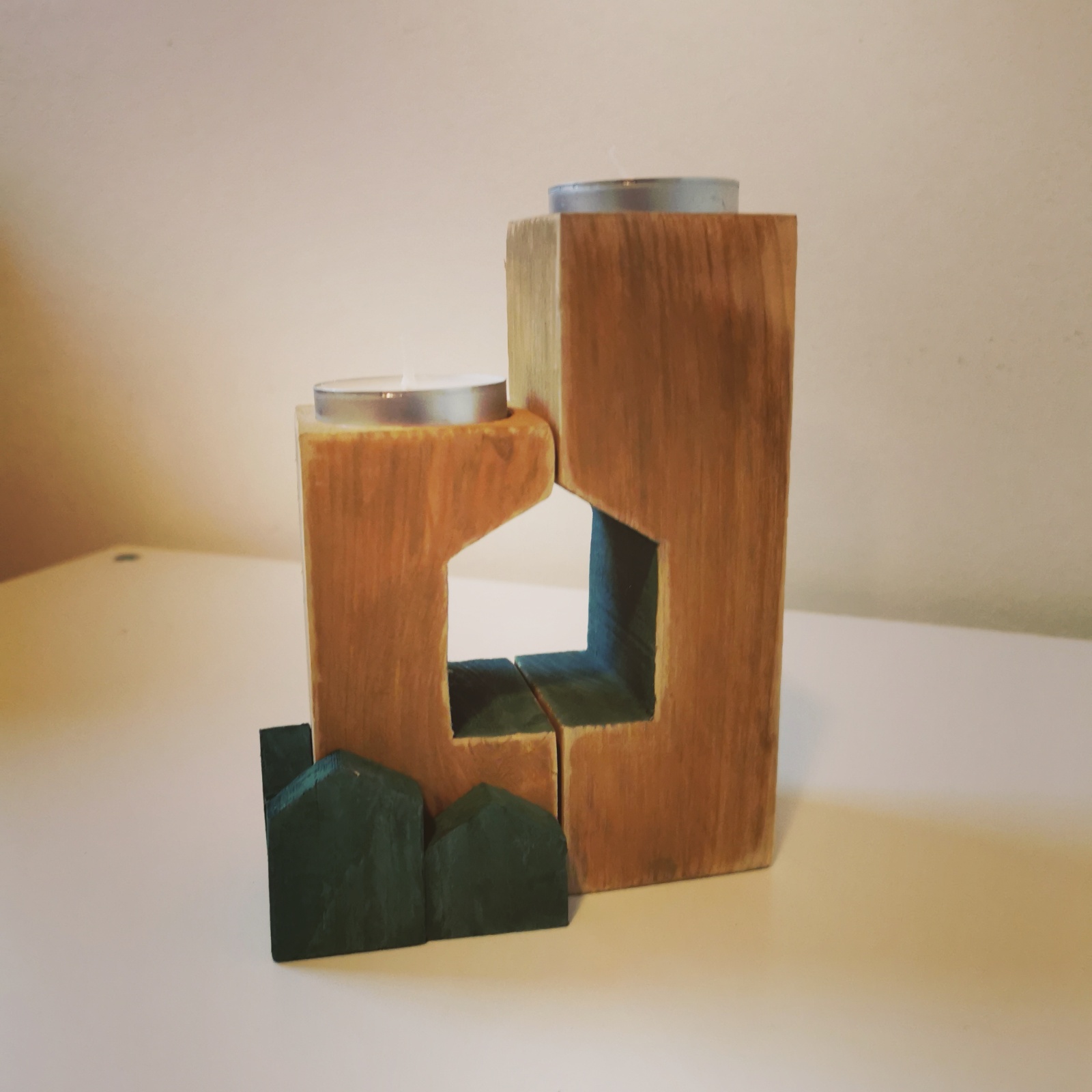 - Dřevěný svícen s domečky pro 2 čajové svíčky