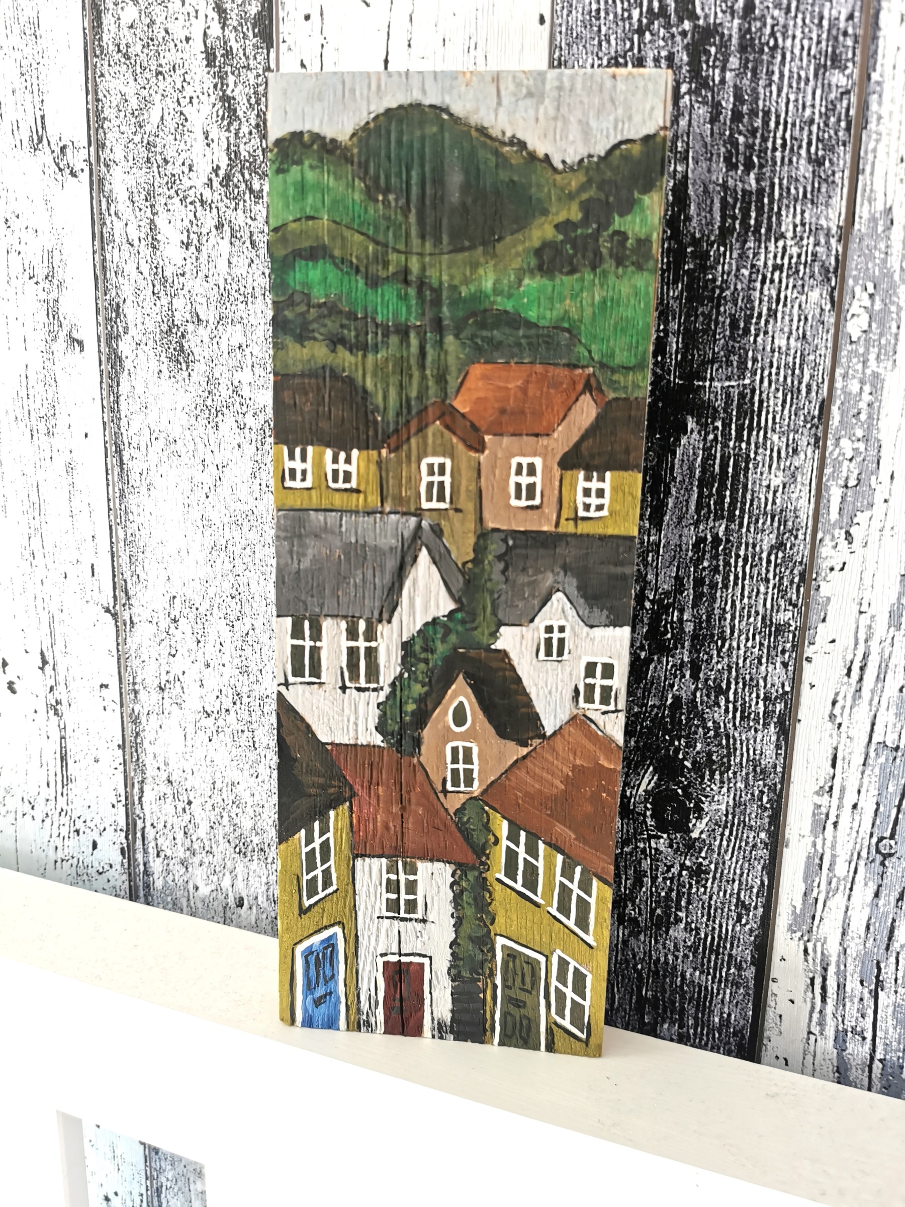 - Malovaný dřevěný obraz s malebnou vesničkou