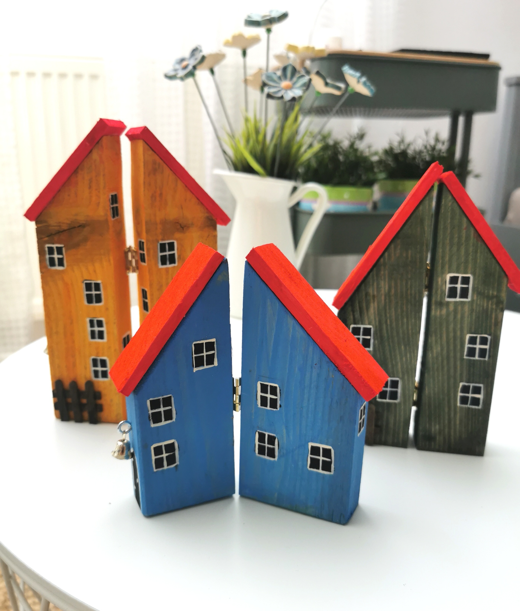 Přinášíme vám půvabnou novinku z naší kolekce dřevěných dekorací: skládací domečky opatřené mosazným pantíkem, které lze rozkládat a tvarovat dle vaší fantazie. Díky třem originálním variantám – žluté, bahenně zelené a modré – snadno vyberete tu, která nejlépe zapadne do vašeho interiéru. Všechny domečky zdobí hřejivě červená střecha, jež nádherně kontrastuje s jemnými odstíny dřeva a vytváří romantický nádech.