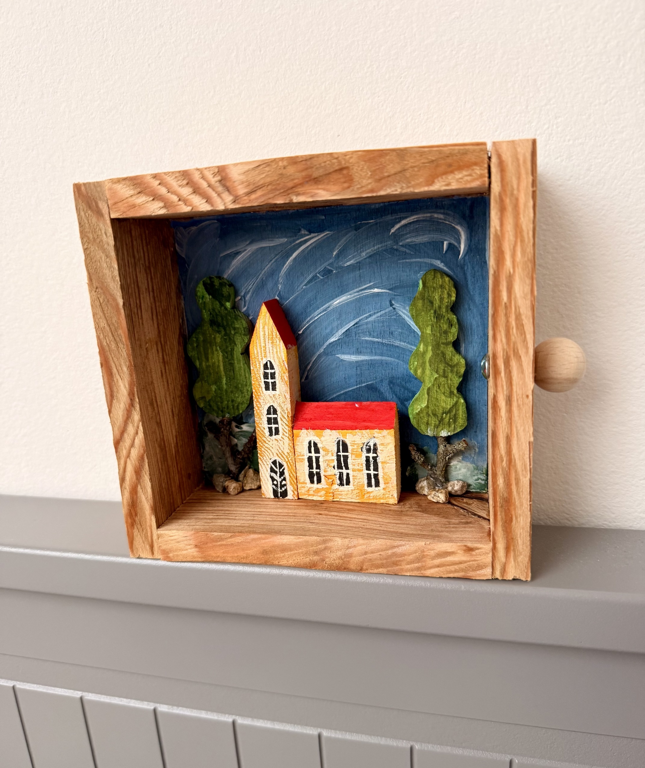 Přineste si do svého domova kouzlo malebného venkova s touto jemnou sérií dřevěných obrázků. Každý obrázek je zasazen do rámu, který připomíná šuplík, s malým dřevěným korálkem jako madlem – působí tak elegantně a hravě zároveň. Romantické motivy malých domečků s červenými střechami nebo kouzelného kostelíčku se stromy a modrou oblohou vás přenesou do světa klidu a pohody.