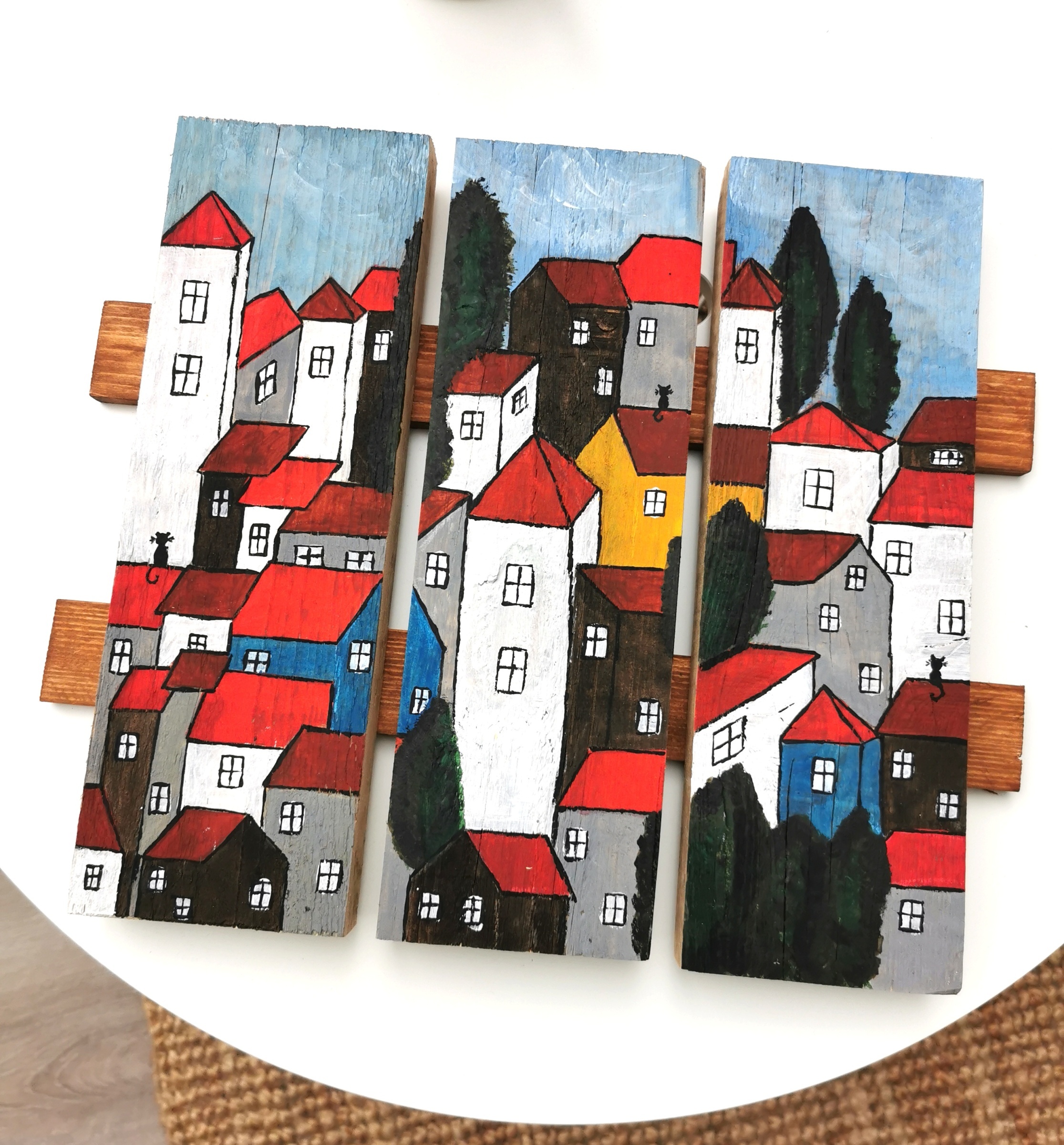 - Třídílný dřevěný obraz s barevnými domečky