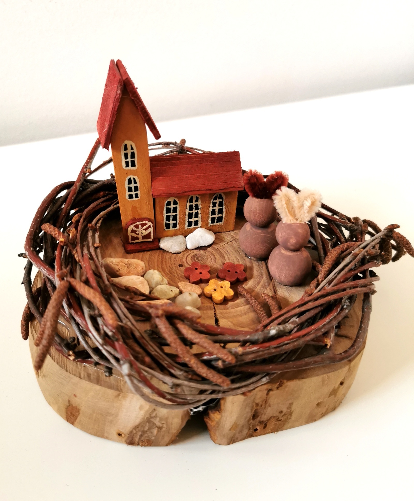 - Velikonoční dekorace na slivoňovém dřevě s kostelíčkem