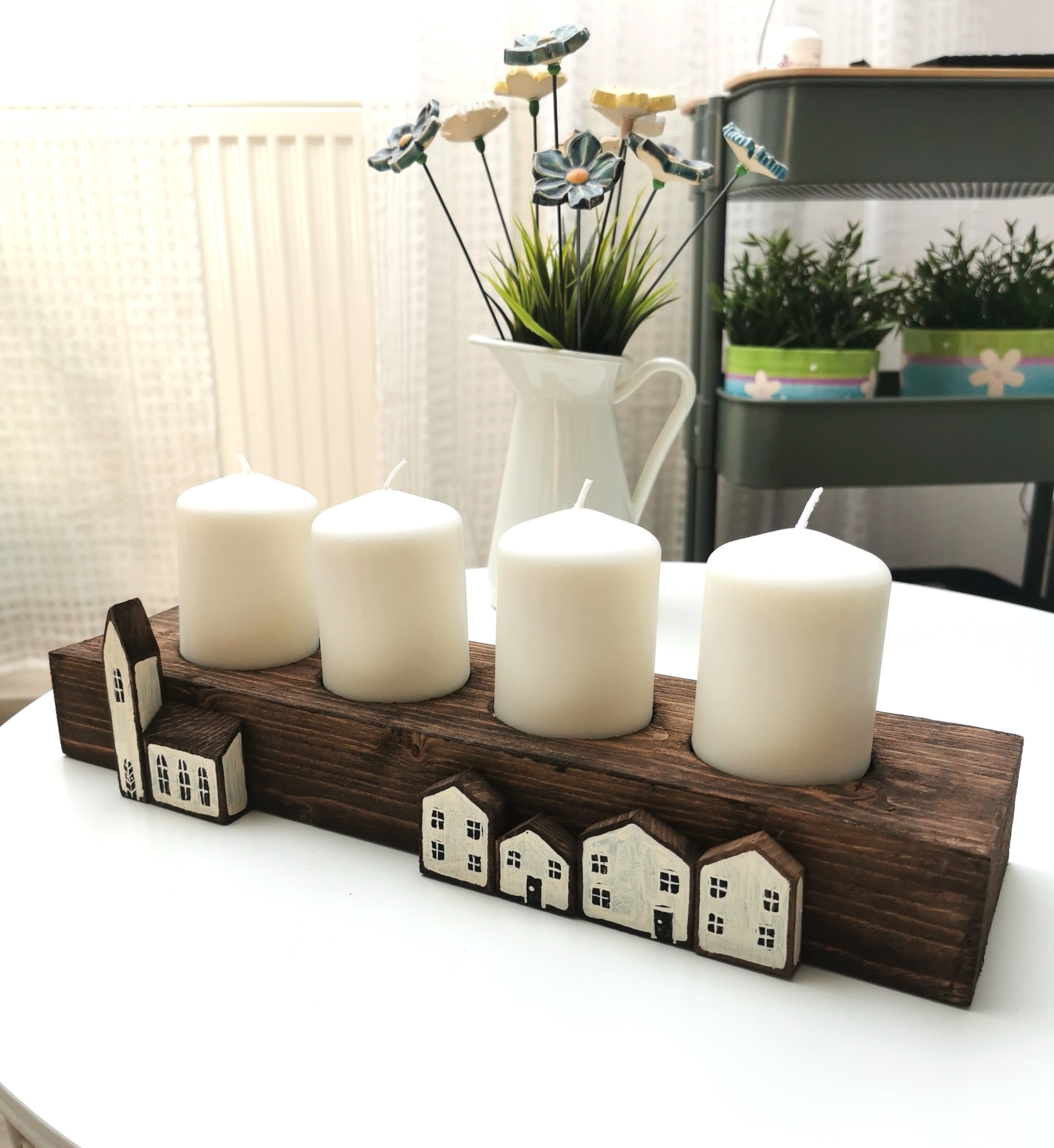 - Přizpůsobení na míru: Na přání Vám rádi vyrobíme svícen v jiných barvách či s jiným počtem domečků, aby odpovídal Vašim představám.