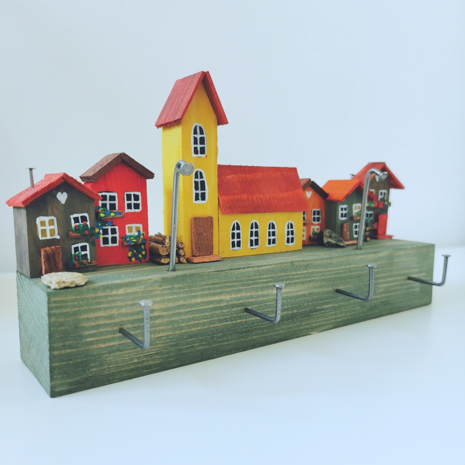 Elegantní design zdobí ručně malované domečky, které připomínají malebnou vesničku. Tento věšák nejen usnadní organizaci vašich klíčů, ale také zvýší estetickou hodnotu vašeho interiéru.