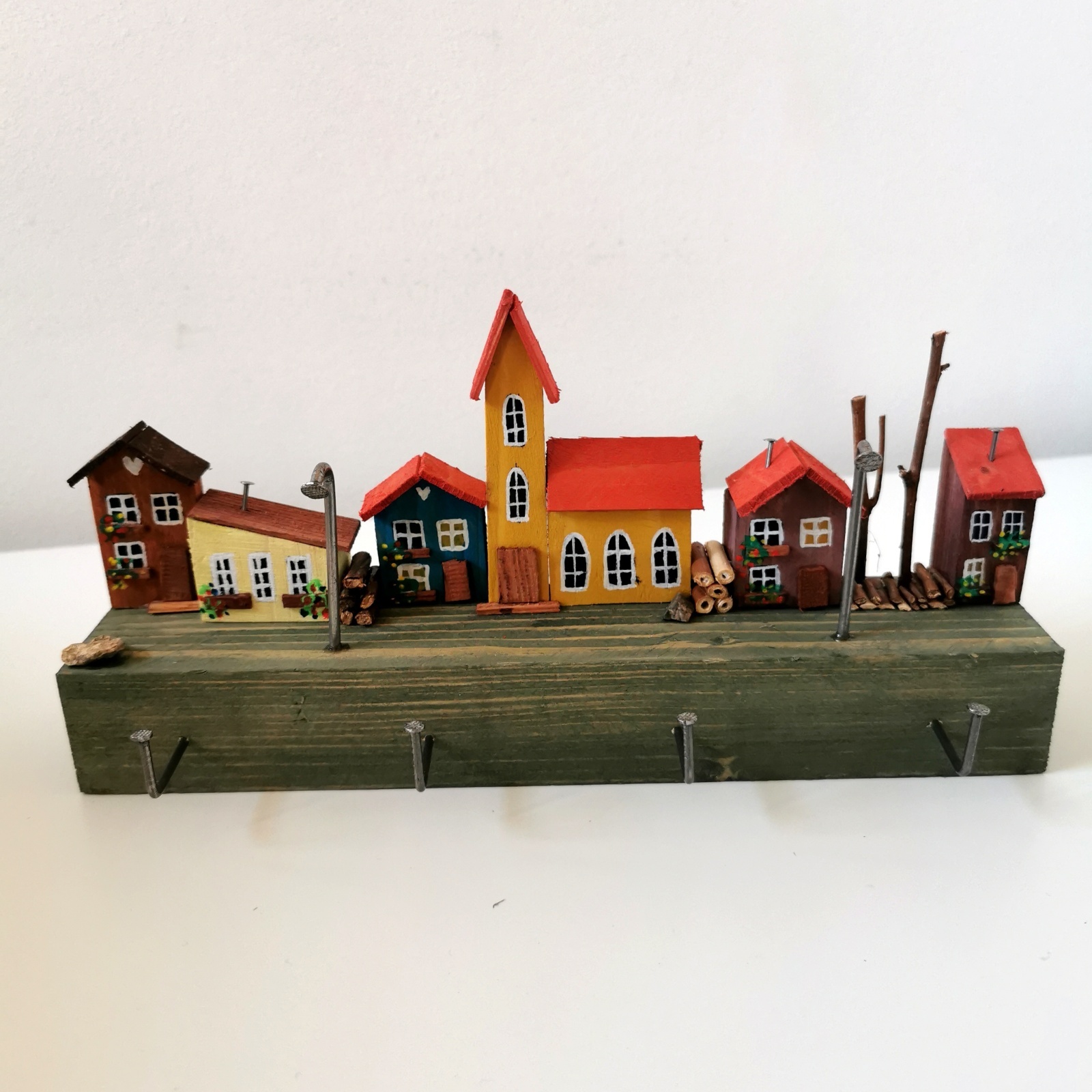 Elegantní design zdobí ručně malované domečky, které připomínají malebnou vesničku. Tento věšák nejen usnadní organizaci vašich klíčů, ale také zvýší estetickou hodnotu vašeho interiéru.