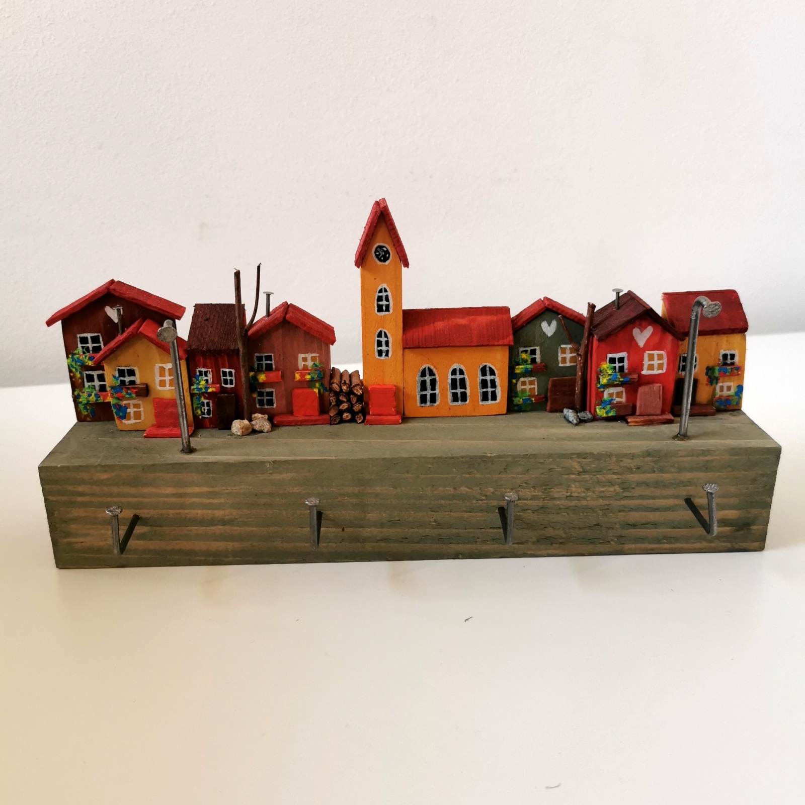Elegantní design zdobí ručně malované domečky, které připomínají malebnou vesničku. Tento věšák nejen usnadní organizaci vašich klíčů, ale také zvýší estetickou hodnotu vašeho interiéru.