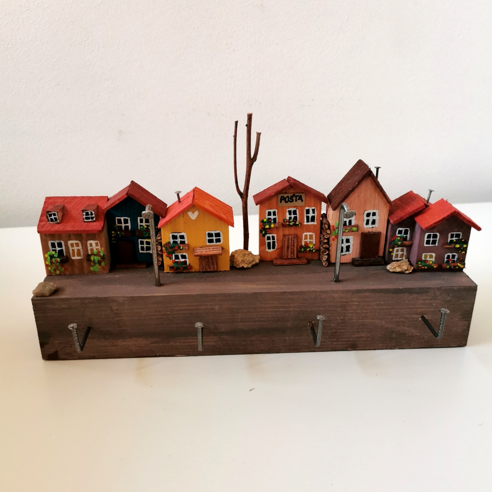 Elegantní design zdobí ručně malované domečky, které připomínají malebnou vesničku. Tento věšák nejen usnadní organizaci vašich klíčů, ale také zvýší estetickou hodnotu vašeho interiéru.