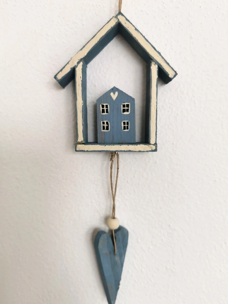 Závěsná dekorace: Vesnický klid a domovská pohoda ve tvaru domečku, osazena srdíčkem a ptáčkem, přináší do interiéru útulnost a harmonii.
