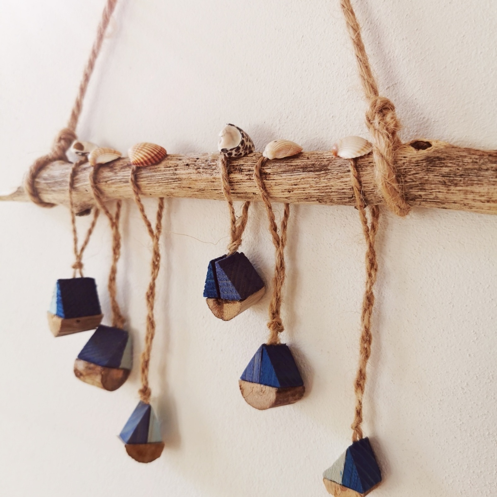 Unikátní design: Šest malých dřevěných lodiček a mušliček je osazeno na větvičce s důrazem na detaily, což přidává dekoraci autentičnost a námořní šarm.